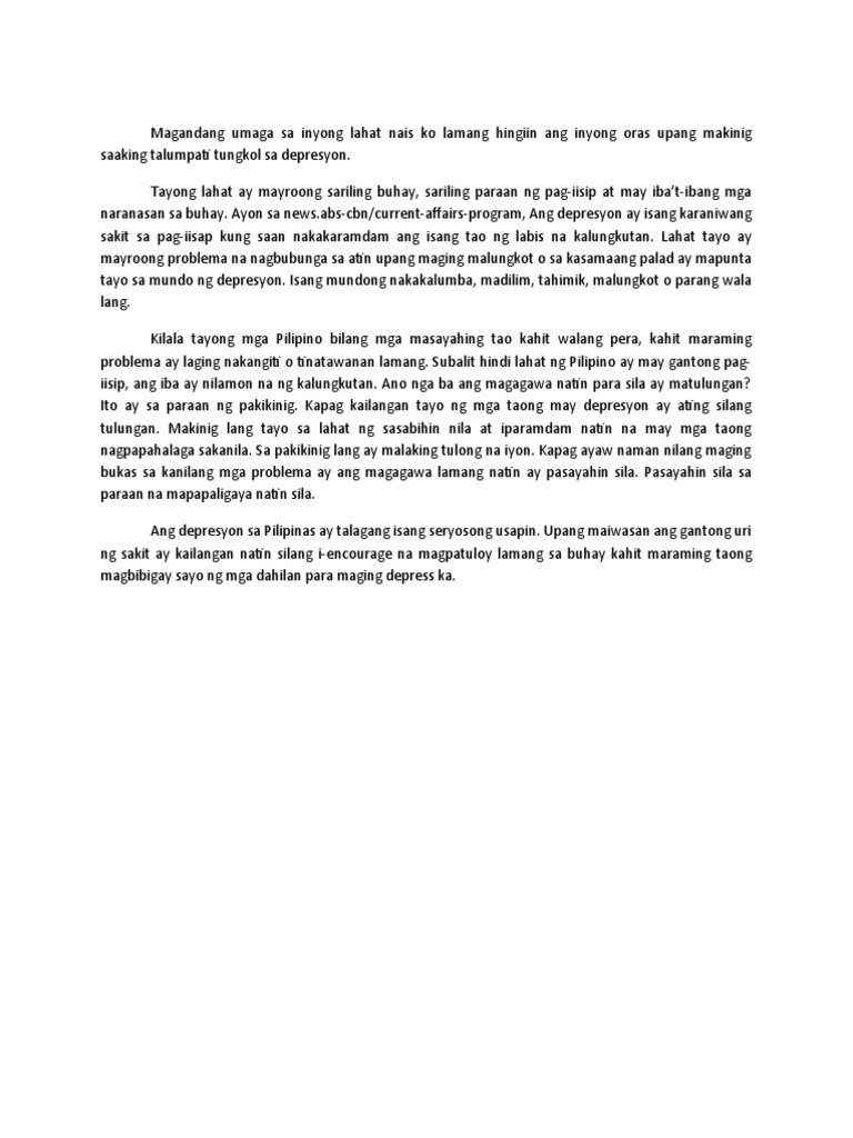 Mga kabataang naligaw na ang landas at napunta sa madilim na mundo. Ang talumpati o speech sa Ingles ay isang akdang pampanitikan kung saan pinababatid ng isang tao ang kanyang opinyon sa pamamagitan ng pagsasalita sa harap ng mga tao sa entablado. Ang aking Buhay minsan masayaminsan malungkot ngunit masarap mabuhay kapag madaming nagmamahal kahit madaming pagsubok man ang dumating sa ating buhay tau ay masaya parin ngunit panu kung ang iyong sarili ay di mo kayang mahalin mahirap magpakatoto sa ating sarili kayat dapat nating mahalin ang ating sarili.
