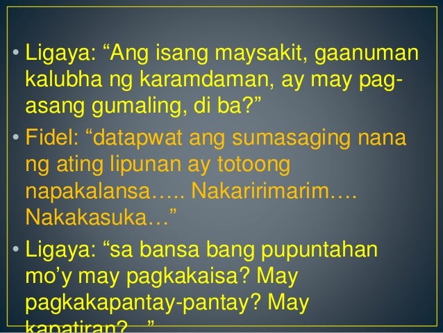 Ang pagbabalak ni Fidel na pumunta ng Amerika ay labis na ipinag-aalala ni Ligaya dahil kakaiba ang uri ng pamumuhay ng mga tao doon at panibagong buhay ang kanilang matatamasa kung doon magtratrabaho si Fidel. At kahit nagkakaroon ng mga pagbabago sa ating wika. FIDEL ROURA OFFICIAL YOUTUBE ACCOUNTThank y.