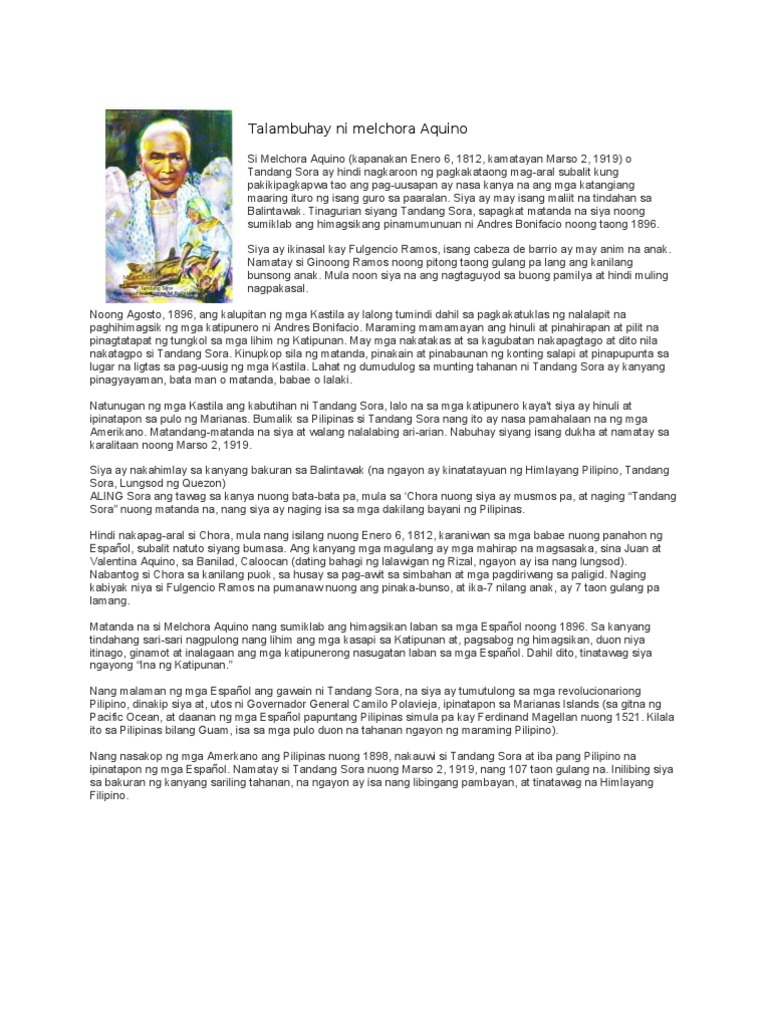 Tinagurian siyang Tandang Sora sapagkat matanda na siya noong sumiklab ang. Si Tandang Sora ay ipinanganak sa Banlat Caloocan sa National Capital Region. Ang talambuhay ni Benigno Aquino in autobiography in tagalog.