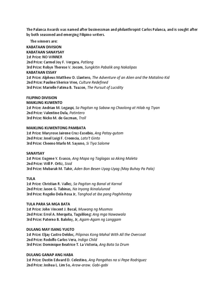 Sanaysay 1st Prize Eugene Evasco Ang Mapa ng Taglagas sa Aking Maleta 2nd Prize Will Ortiz Sisid and 3rd Prize Mubarak Tahir Aden Bon Besen Uyag-Uyag May Buhay Pa Pala. Aden Bon Besen Uyag-uyag May Buhay Pa Pala Third prize Tahir Mubarak M. Muli nating basahin ang sanaysay ni Mubarak M.