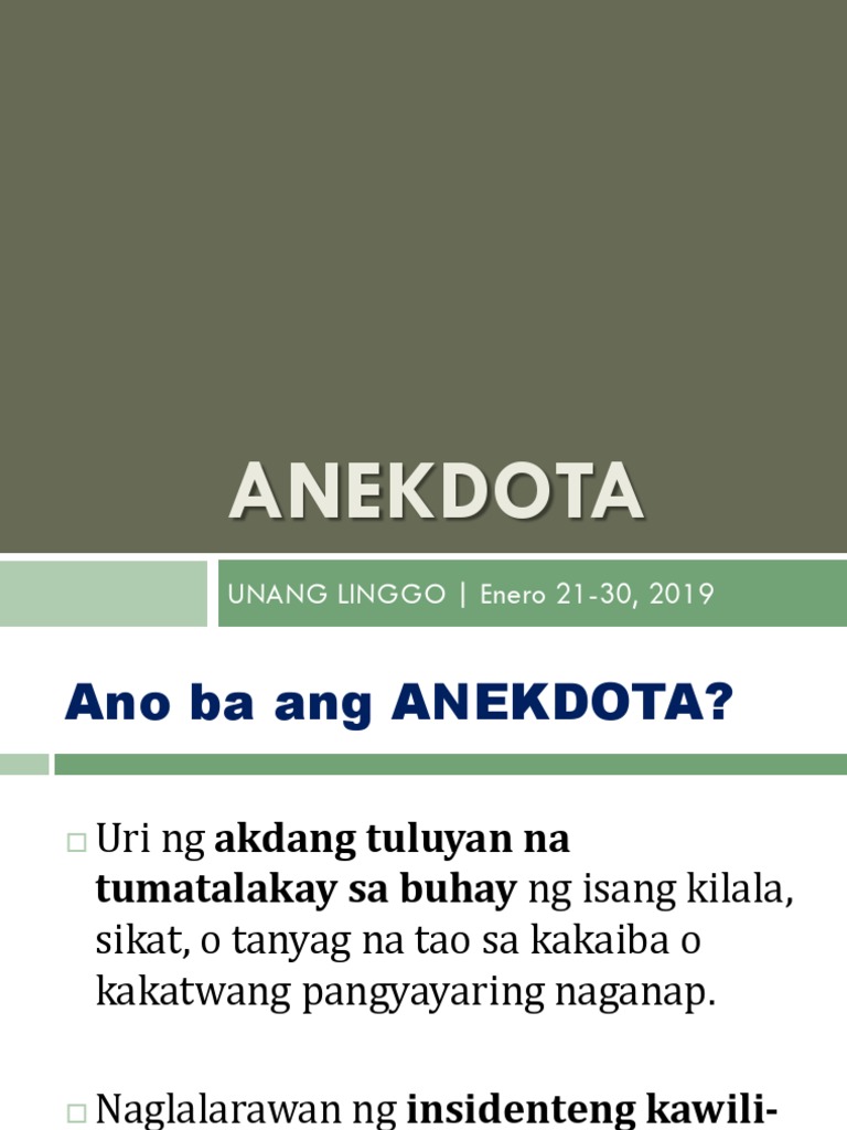 ANEKDOTA Sa paksang ito tatalakayin natin kung ano nga ba ang anekdota at mga halimbawa nito. Noong ako ay walong taong gulang pa lamang ay may kaibigan ako sa aming paaralan sa probinsiya.